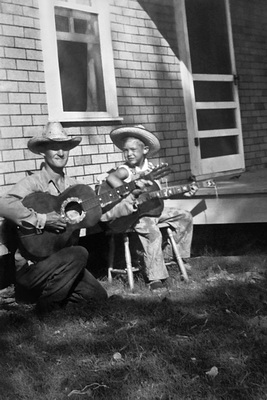 Dave, age 6 or 7, with his father by the porch of their Franklin home, circa 1948. Clearly, Dave had some experience with a guitar before taking it up seriously at age 12. |