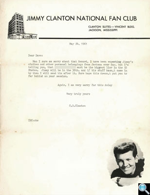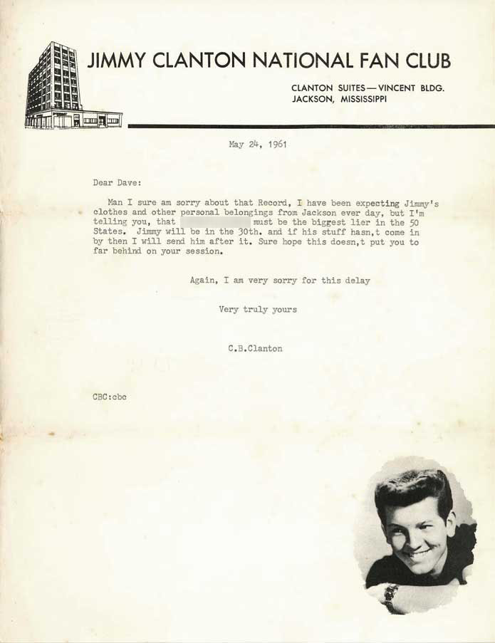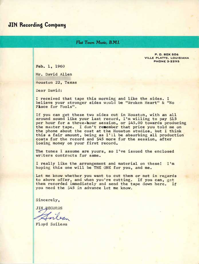 Letter from Floyd Soileau of Jin Recording Company formally accepting the demo tapes for “My Broken Heart” and “What’s Left for a Fool,” and offering to reimburse Dave $45.00 in recording expenses, dated February 1, 1960. |
