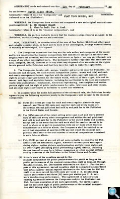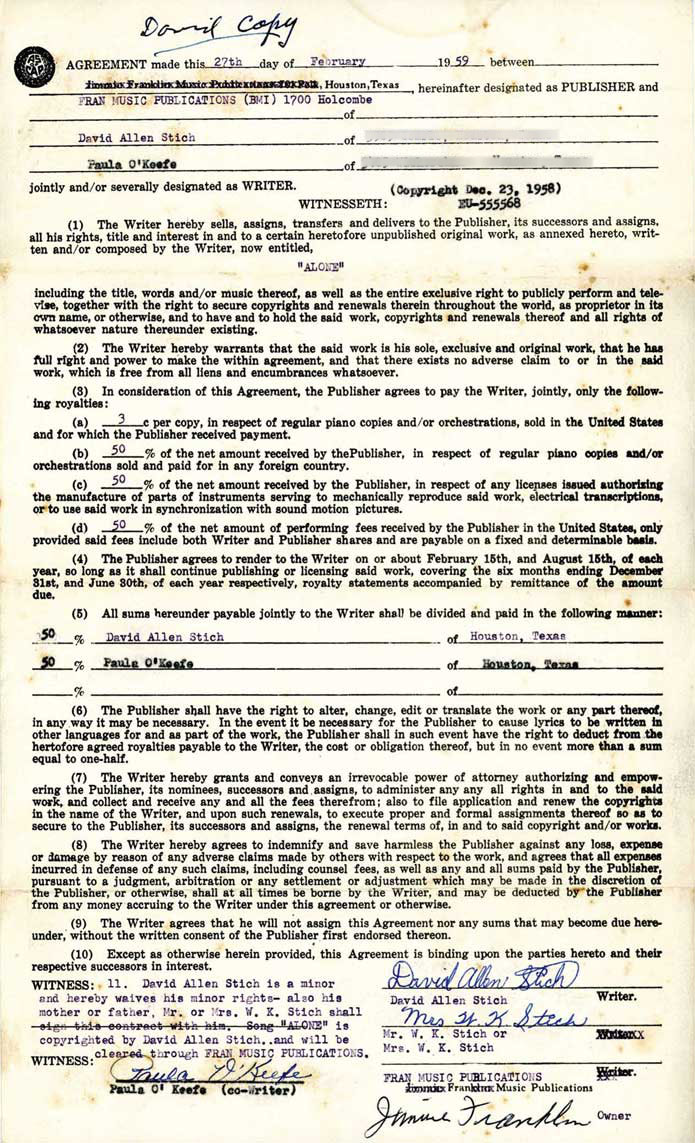 Contractual assignment, typically draconian for its era, for publishing rights of “Alone” to Jimmie Franklin of Fran Music Publications, dated February 27, 1959. Dave’s mother had to co-sign because Dave was still a minor. |