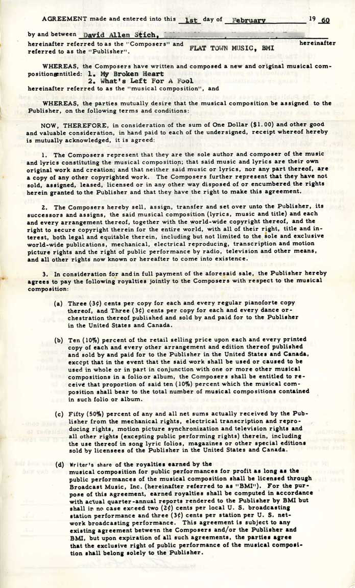 Contractual assignment attached to above cover letter for publishing rights of “My Broken Heart” and “What’s Left for a Fool” to Floyd Soileau of Jin Records and its subsidiary Flat Town Music for the nominal sum of $1.00, dated February 1, 1960. |