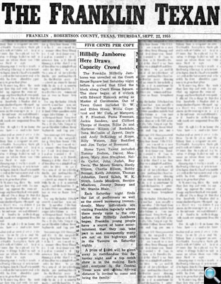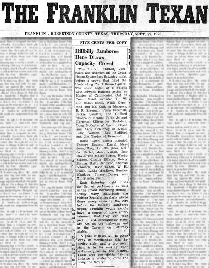 | Newspaper clipping from The Franklin Texan reporting on the Hillbilly Jamboree, published September 22, 1955. A more formal article lauding the Jamboree that mentions Dave and his father as two of the original organizers. (The Franklin event later evolved into the ongoing New Baden Jamboree.) Noting the Jamboree’s increasing popularity, the article calls it an occasion where “Franklin young people have a source of entertainment…and consequently are not on the highways and in the Taverns (sic) on Saturday nights.” In a related but somewhat contradictory article in the same edition, the Franklin Chamber of Commerce expressed concern to Dave’s father that “the Jamboree was interfering with the expected proceeds of the new Franklin Theater movie house” (with a wealthy Robertson County businessman as the main investor). Because the Jamboree had been moved outdoors to accommodate a growing audience, city officials asked Mr. Stich to hold the Jamboree in the theater on a night other than Saturday. Mr. Stich replied to the effect that Saturday was the only night most musicians were available and the theater was too small anyway. In the final paragraph, the article dramatically compares the dilemma to that of King Solomon and the baby. |