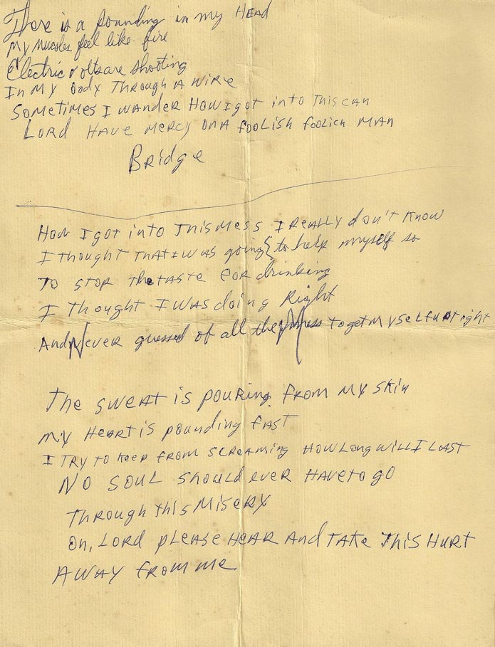 Handwritten lyrics to “Lord Have Mercy” from the Color Blind sessions, 1968. Written on the back of a concert flyer that Dave found in the International Artists offices. |