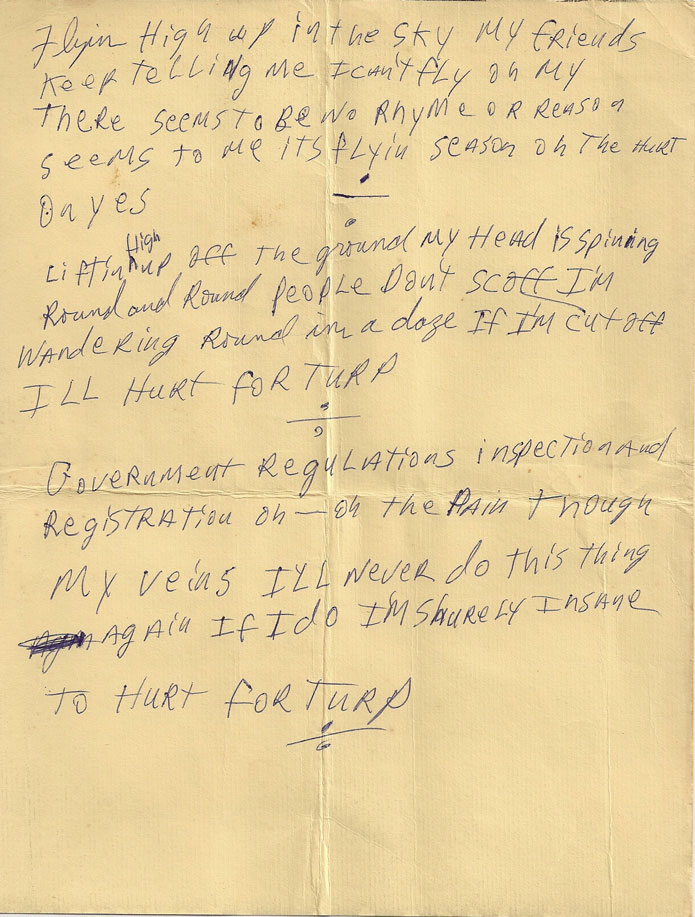 | Handwritten lyrics to “Terp” from the Color Blind sessions, 1968. Written on the back of a concert flyer that Dave found in the International Artists offices. |