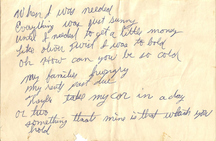 Fragment of handwritten lyrics to “How Can You Be So Cold” from the Color Blind sessions, 1968. |