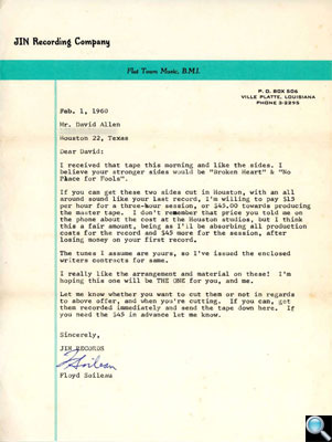 Letter from Floyd Soileau of Jin Recording Company formally accepting the demo tapes for “My Broken Heart” and “What’s Left for a Fool,” and offering to reimburse Dave $45.00 in recording expenses, dated February 1, 1960. |
