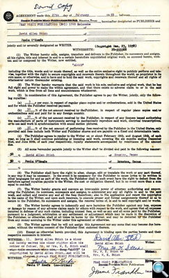 Contractual assignment, typically draconian for its era, for publishing rights of “Alone” to Jimmie Franklin of Fran Music Publications, dated February 27, 1959. Dave’s mother had to co-sign because Dave was still a minor. |