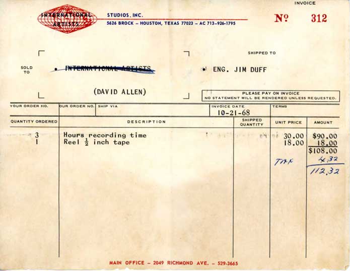 International Artists Studio recording invoice for a three-hour Color Blind session with engineer Jim Duff, dated October 21, 1968. |
