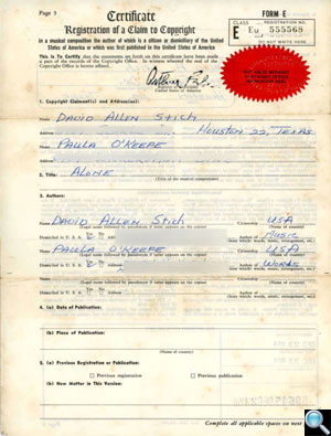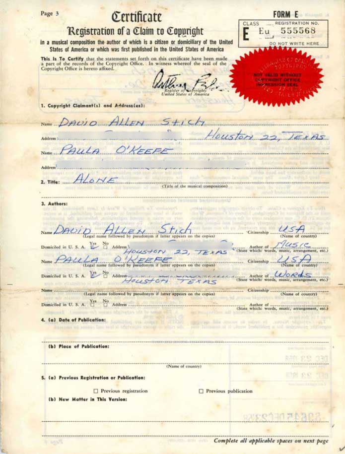 Registration of a claim to copyright in a musical composition by David Allen Stich (music) and Paula O’Keefe (words) for “Alone,” dated December 23, 1958. Although written and recorded in 1958, “Alone” did not appear as a Jin single until 1960. |