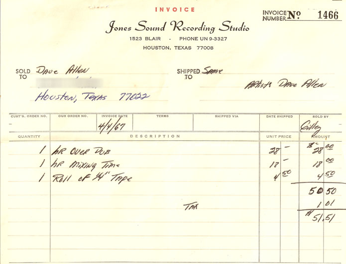 | Jones Recording Studio invoice for a mixing session, presumably for one of Dave’s demo tapes, dated April 4, 1967. Itemized and signed by country singer and future owner of the world-famous Gilley’s Club, Mickey Gilley, then an associate of Jones Recording. |