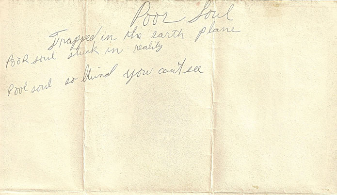 | Fragment of handwritten lyrics to “Poor Soul” from the Color Blind sessions, 1968. |