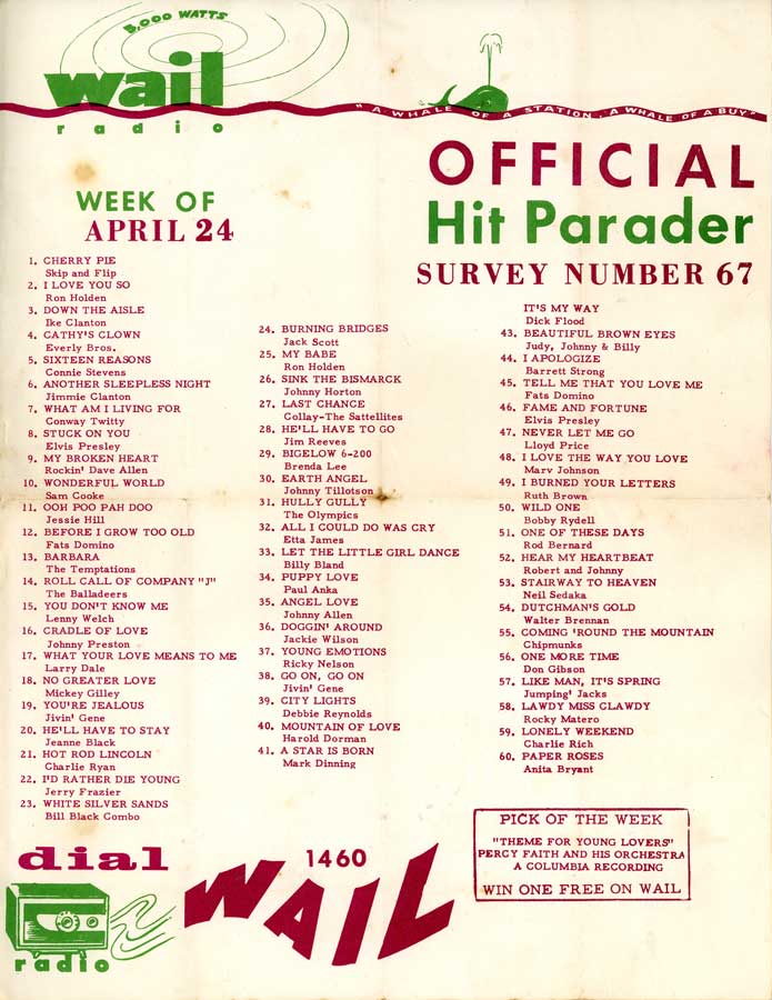 | Hit Parader record chart from radio station WAIL, 1460 AM, week of April 24, 1960. Dave’s hit “My Broken Heart” charted at number nine, after “Stuck on You” by Elvis Presley and before “Wonderful World” by Sam Cooke. (“Cherry Pie” by Skip and Flip was listed as the number one song that week. “Flip,” a.k.a. Gary S. Paxton, is probably best known for later producing the novelty hit “Monster Mash” by Bobby “Boris” Pickett.) WAIL-AM’s location is lost to online history, but it is not be confused with WAIL-FM currently broadcasting from Key West, Florida. |